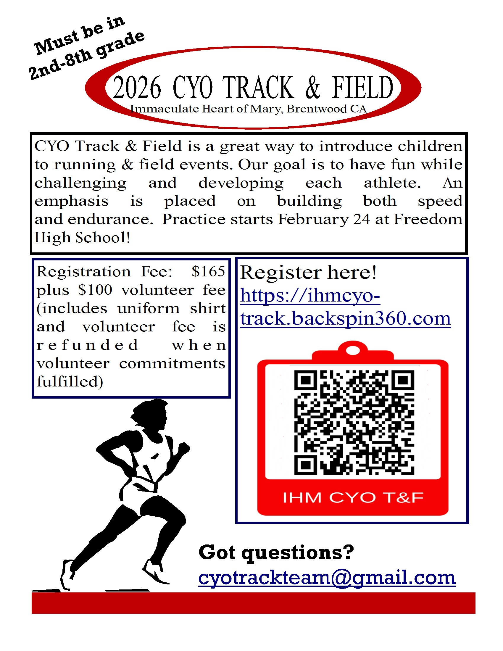 Below is the link to register. You must complete it in its entirety, including uploading documents. The good news is that you should only have to do this one season and then going forward, it should be even faster. When you launch the link below, you may either sign in with a google account (what I did) or create a backspin login. Practices start 2/24! Please note the calendar for the season is attached, as well as there are 2 documents before you start the registration process titled Program Information and Volunteer Descriptions. Please read these documents as there is importation information in those documents. Practices are T/W/Th at Freedom High School from 6-7 except for the first 2 weeks which are 5:30-6:30 on 2/24-3/5. https://ihmcyo-track.backspin360.comA few more reminders:1.Athletes must be in at least 2nd grade. Unfortunately, those in Kinder-1st grade are not yet eligible to run. 2.You can still reference some information on our website below in our signature, However, we are changing websites in the near future so the information is not all updated. Thank you for your patience. 3.No refunds will be processed once the track season has started (this means our first day of practice, 2/24). Please ensure you read the cancellation policy in the registration before you pay. 4.Emails will come from this email address, and once registration is complete, they will come from ihmcyo-track@backspin360.com , so please be sure to save both to your safe senders list. 5.This years flyer is also attached so that you can share with your friends!Welcome to another fun filled year with CYO Track & Field!