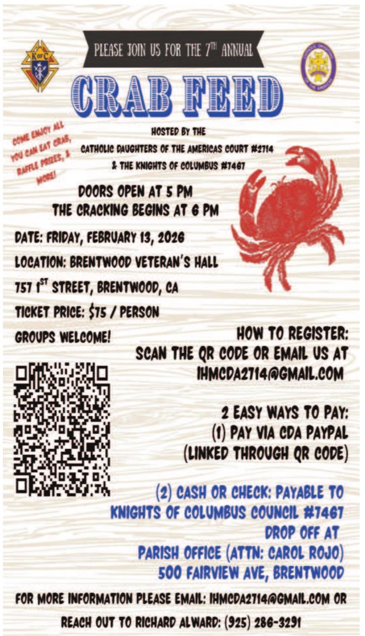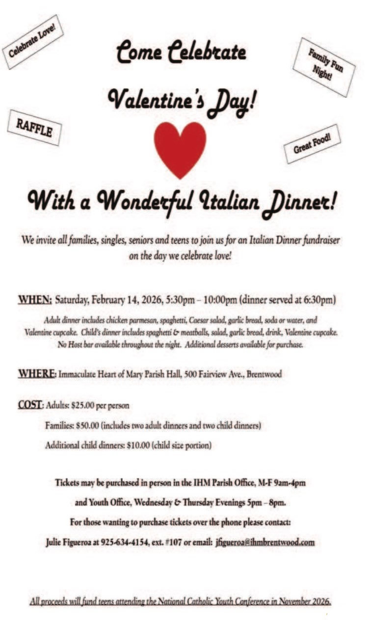 DESAYUNO DE PANQUECASVengán a visitar con sus amigos parroquianos y darles la bienvenida a los nuevos parroquianos al desayuno de pancakes el primer Domingo de cada mes. El próximo domingo el desayuno será patrocinado por el Ministerio de la Movimiento Familia Cristiano. Horario del desayuno es de 8:15am a 12:00pmAltar Server Invitation–No Experience NecessaryThe Spanish and English Altar Server Ministries are accepting new applicants. To be eligible, your family must be registered in the parish, you must have made First Communion, and have a willingness to serve our Lord at the altar. If you are interested, please contact Tim Guernsey at tguernsey@sbcglobal.net, or call 925-457-4519Please park correctly / Por favor, estacione correctamenteThank you for not parking in red zones. However, we would appreciate if you could be sure to park straight in the parking stalls. We have noticed several open parking spaces because cars are parked at an angle or over the lines. If everyone would be better at parking straight there would be more available parking spaces. Again thank you for your cooperation.Gracias por no estacionar en las zonas rojas. Sin embargo, le agradeceríamos que se asegure de estacionar derecho en los puestos de estacionamiento. Hemos notado varios espacios de estacionamiento vacios porque los autos están mal estacionados, en angulo o sobre la linea blanca. Si todos pudieran estacionar derechos habrian mas puestos libres para estacionar. De nuevo gracias por su cooperacion.Catechesis CornerThe Catechesis Corner is a monthly newsletter which highlights aspects of the faith. You can find the latest edition of the Catechesis Corner in the vestibule. You can also sign up to receive it once monthly via Flocknote. Go to Flocknote and join the IHM Catechesis Corner group or send your request to Deanna at d.betschart24@outlook.com.El Catechesis Corner es un boletín mensual que destaca aspectos de la fe. En el vestíbulo se encuentra la última edición del Catechesis Corner. También pueden registrarse para recibirlo una vez al mes a través de Flocknote. Vaya a Flocknote y únase al grupo de IHM Catechesis Corner o envíe su solicitud a Deanna al d.betschart24@outlook.com.Youth CornerS.A.L.T. LeadershipApplications for S.A.L.T. teens (Students and Adults Leading Together) are now open. This team of teens help with various events throughout the year, like leading small groups, assisting at Mass in different capacities, retreat leaders, EDGE program and other awesome events. Please email Julie (ihmyouthbrentwood@ gmail.com) to get an application. A great way to get involved, meet more people, celebrate your faith while having fun.SAINT(s) - Real Life Role Models:Lets hear it for a few of God's amazing Holy heroes: St. Maria Goretti (Patroness of Youth and Young Women) , St. Benedict (Patron of Students), St. Kateri( Covert to the faith at age 19) and St. Ann and St. Joachim (Grandparents to Jesus). Check out these amazing role models. Some are young - some are older. As you check into their stories you may a find a new heavenly friend to accompany you on your journey. One website to look up Saints is atholiconline.org/saints/Youth Ministry Invites You!!We welcome all teens grades 6-12 to join our Edge Middle School Ministry, Tuesdays 4:15-5:15pm, or our High School Youth Ministry program, Thursdays 6:30-8pm. Enrollment is taken year around for these groups! We participate in Bible studies, faith talks, prayer experiences, games, retreats, snacks and social events. Please email Julie Figueroa at ihmyouthbrentwood@gmail.com for more information. All are welcome!