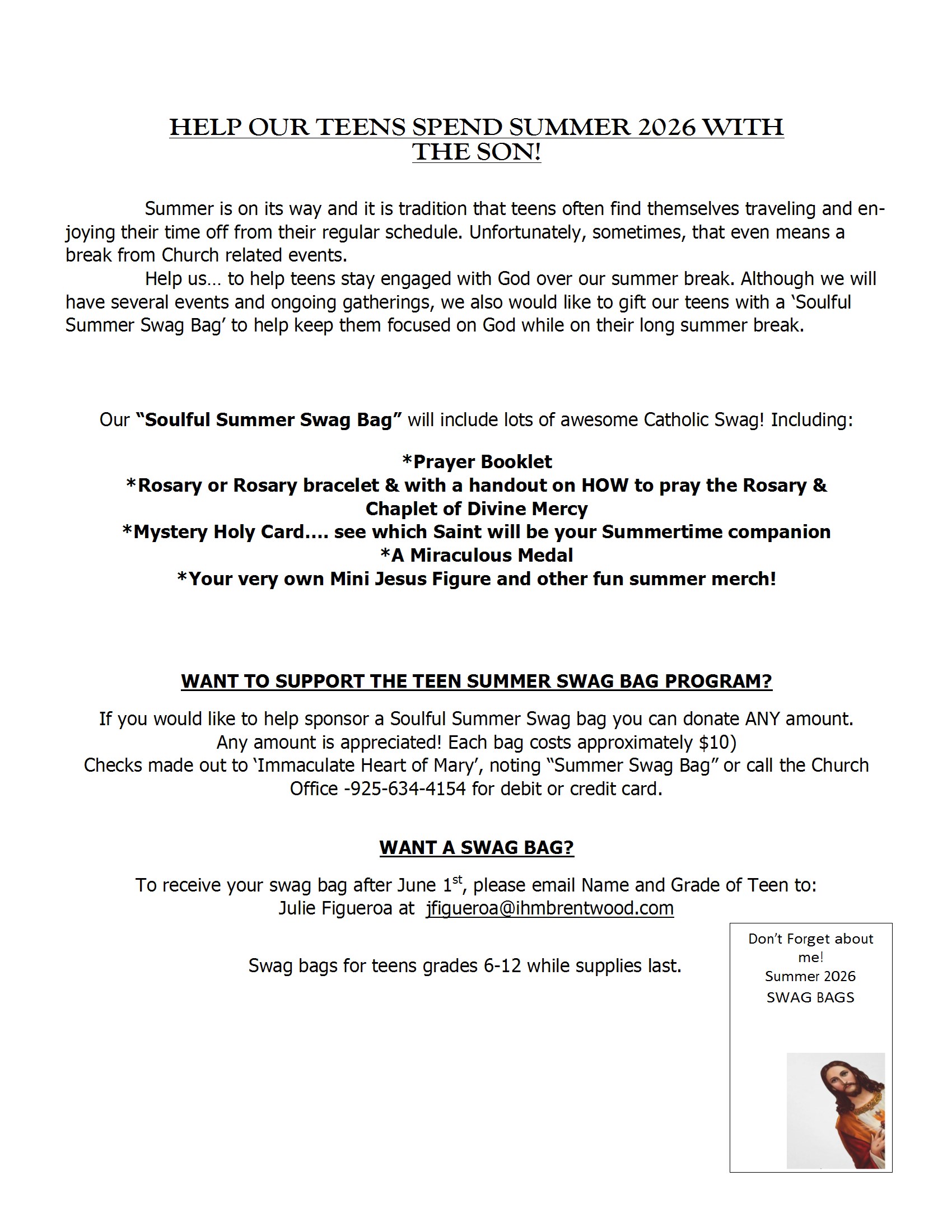 We will be teaching a class on the Mass to aid understanding of what is truly happening in this great liturgy. We will be going through the book What Happens at Mass Revised Edition by Fr. Jeremy Driscoll, OSB. Please purchase the book beforehand. It is available on Amazon. The class will begin on Friday, April 17, 2026, at 7 pm in the library. The class will be 6-7 weeks long. Please join Mrs. Julie St. Andre, OP, and Mr. Mark DeMarce, OP, for this opportunity to deepen your understanding and participation in the Mass.Altar Server Invitation–No Experience NecessaryThe Spanish and English Altar Server Ministries are accepting new applicants. To be eligible, your family must be registered in the parish, you must have made First Communion, and have a willingness to serve our Lord at the altar. If you are interested, please contact Tim Guernsey at tguernsey@sbcglobal.net, or call 925-457-4519Please park correctly / Por favor, estacione correctamenteThank you for not parking in red zones. However, we would appreciate if you could be sure to park straight in the parking stalls. We have noticed several open parking spaces because cars are parked at an angle or over the lines. If everyone would be better at parking straight there would be more available parking spaces. Again thank you for your cooperation.Gracias por no estacionar en las zonas rojas. Sin embargo, le agradeceríamos que se asegure de estacionar derecho en los puestos de estacionamiento. Hemos notado varios espacios de estacionamiento vacios porque los autos están mal estacionados, en angulo o sobre la linea blanca. Si todos pudieran estacionar derechos habrian mas puestos libres para estacionar. De nuevo gracias por su cooperacion.Catechesis CornerThe Catechesis Corner is a monthly newsletter which highlights aspects of the faith. You can find the latest edition of the Catechesis Corner in the vestibule. You can also sign up to receive it once monthly via Flocknote. Go to Flocknote and join the IHM Catechesis Corner group or send your request to Deanna at d.betschart24@outlook.com.El Catechesis Corner es un boletín mensual que destaca aspectos de la fe. En el vestíbulo se encuentra la última edición del Catechesis Corner. También pueden registrarse para recibirlo una vez al mes a través de Flocknote. Vaya a Flocknote y únase al grupo de IHM Catechesis Corner o envíe su solicitud a Deanna al d.betschart24@outlook.com.Youth CornerS.A.L.T. LeadershipApplications for S.A.L.T. teens (Students and Adults Leading Together) are now open. This team of teens help with various events throughout the year, like leading small groups, assisting at Mass in different capacities, retreat leaders, EDGE program and other awesome events. Please email Julie (ihmyouthbrentwood@ gmail.com) to get an application. A great way to get involved, meet more people, celebrate your faith while having fun.Youth Ministry Invites You!!We welcome all teens grades 6-12 to join our Edge Middle School Ministry, Tuesdays 4:15-5:15pm, or our High School Youth Ministry program, Thursdays 6:30-8pm. Enrollment is taken year around for these groups! We participate in Bible studies, faith talks, prayer experiences, games, retreats, snacks and social events. Please email Julie Figueroa at ihmyouthbrentwood@gmail.com for more information. All are welcome!