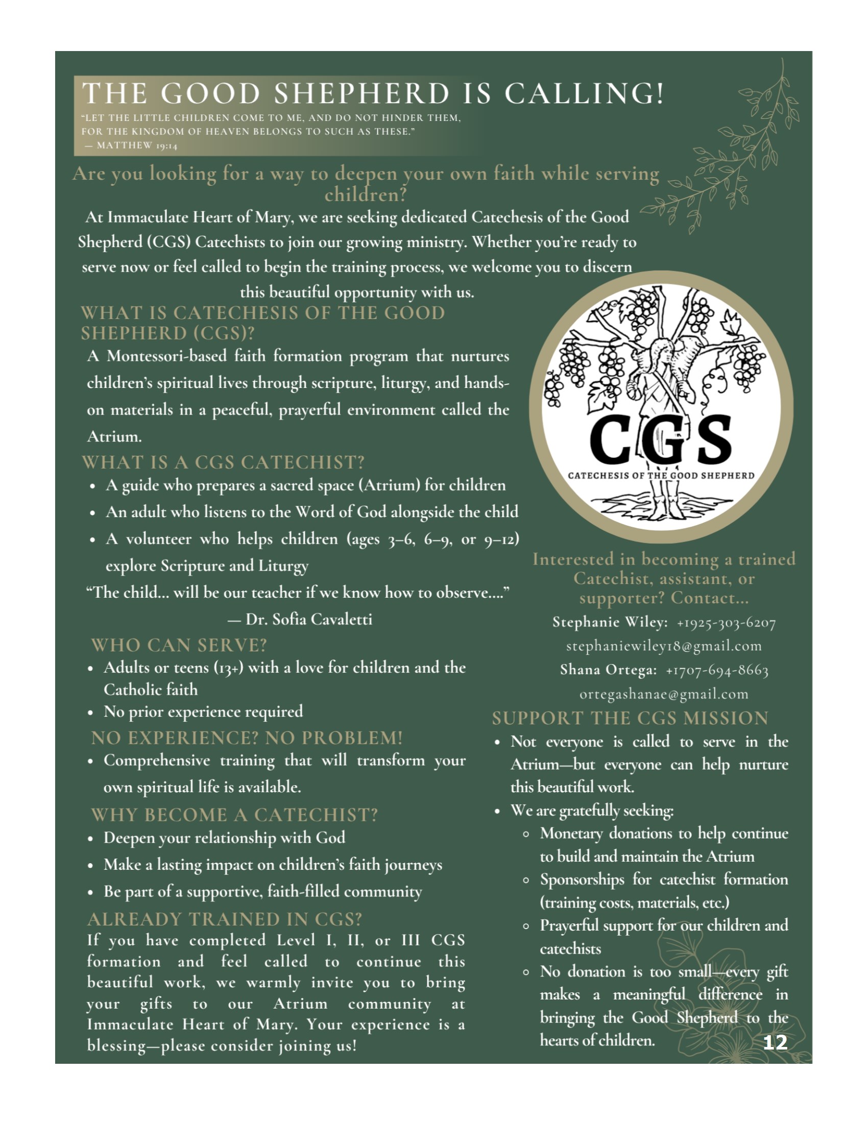 We will be teaching a class on the Mass to aid understanding of what is truly happening in this great liturgy. We will be going through the book What Happens at Mass Revised Edition by Fr. Jeremy Driscoll, OSB. Please purchase the book beforehand. It is available on Amazon. The class will begin on Friday, April 17, 2026, at 7 pm in the library. The class will be 6-7 weeks long. Please join Mrs. Julie St. Andre, OP, and Mr. Mark DeMarce, OP, for this opportunity to deepen your understanding and participation in the Mass.Altar Server Invitation–No Experience NecessaryThe Spanish and English Altar Server Ministries are accepting new applicants. To be eligible, your family must be registered in the parish, you must have made First Communion, and have a willingness to serve our Lord at the altar. If you are interested, please contact Tim Guernsey at tguernsey@sbcglobal.net, or call 925-457-4519Please park correctly / Por favor, estacione correctamenteThank you for not parking in red zones. However, we would appreciate if you could be sure to park straight in the parking stalls. We have noticed several open parking spaces because cars are parked at an angle or over the lines. If everyone would be better at parking straight there would be more available parking spaces. Again thank you for your cooperation.Gracias por no estacionar en las zonas rojas. Sin embargo, le agradeceríamos que se asegure de estacionar derecho en los puestos de estacionamiento. Hemos notado varios espacios de estacionamiento vacios porque los autos están mal estacionados, en angulo o sobre la linea blanca. Si todos pudieran estacionar derechos habrian mas puestos libres para estacionar. De nuevo gracias por su cooperacion.Catechesis CornerThe Catechesis Corner is a monthly newsletter which highlights aspects of the faith. You can find the latest edition of the Catechesis Corner in the vestibule. You can also sign up to receive it once monthly via Flocknote. Go to Flocknote and join the IHM Catechesis Corner group or send your request to Deanna at d.betschart24@outlook.com.El Catechesis Corner es un boletín mensual que destaca aspectos de la fe. En el vestíbulo se encuentra la última edición del Catechesis Corner. También pueden registrarse para recibirlo una vez al mes a través de Flocknote. Vaya a Flocknote y únase al grupo de IHM Catechesis Corner o envíe su solicitud a Deanna al d.betschart24@outlook.com.Youth CornerS.A.L.T. LeadershipApplications for S.A.L.T. teens (Students and Adults Leading Together) are now open. This team of teens help with various events throughout the year, like leading small groups, assisting at Mass in different capacities, retreat leaders, EDGE program and other awesome events. Please email Julie (ihmyouthbrentwood@ gmail.com) to get an application. A great way to get involved, meet more people, celebrate your faith while having fun.Youth Ministry Invites You!!We welcome all teens grades 6-12 to join our Edge Middle School Ministry, Tuesdays 4:15-5:15pm, or our High School Youth Ministry program, Thursdays 6:30-8pm. Enrollment is taken year around for these groups! We participate in Bible studies, faith talks, prayer experiences, games, retreats, snacks and social events. Please email Julie Figueroa at ihmyouthbrentwood@gmail.com for more information. All are welcome!