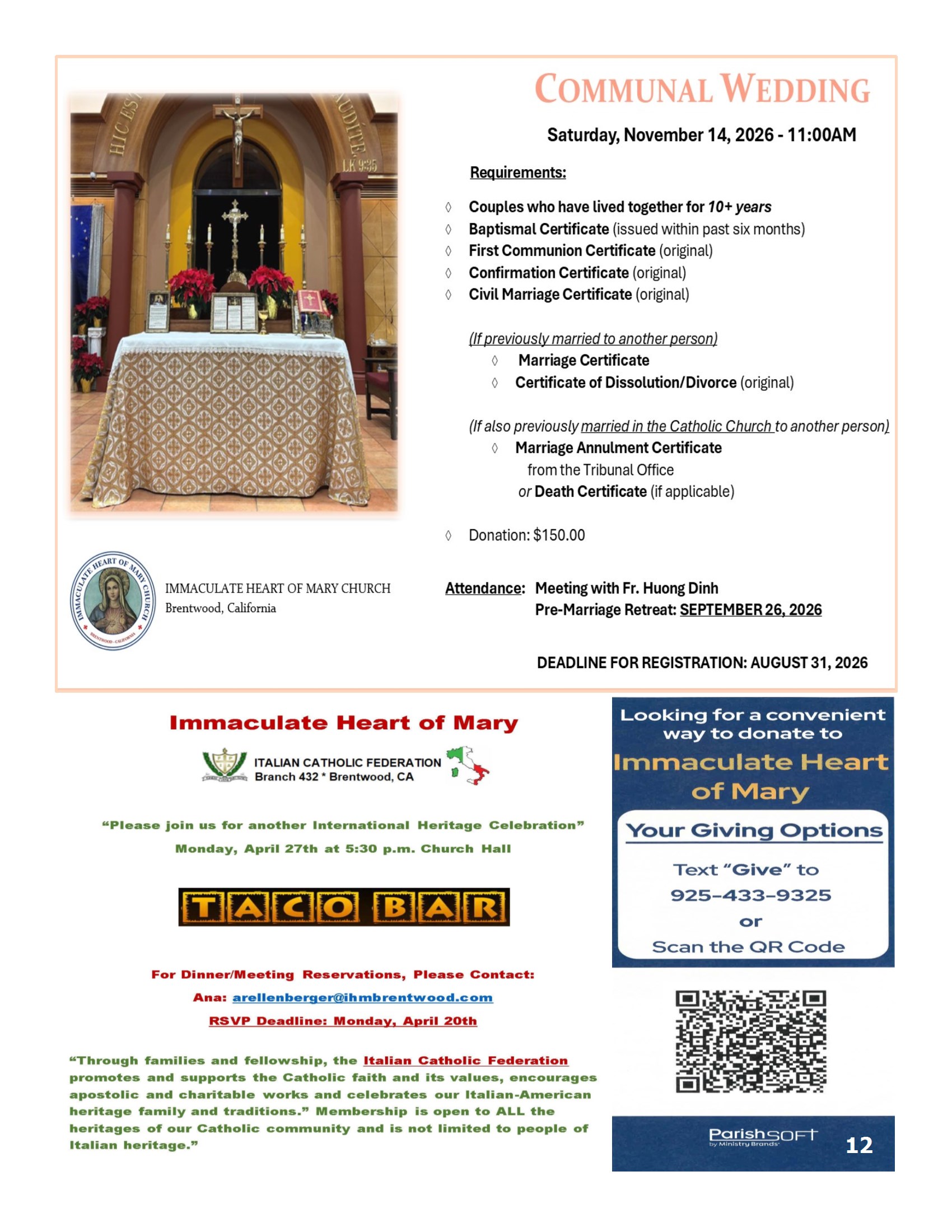 Are you new to Immaculate Heart of Mary?We Welcome you! We are a very vibrant and active parish in Brentwood whose mission is, “With Mary, we seek to know Christ better and to make him better known through our words and actions.” We do this in a variety of ways through our several sacramental prep programs, social outreach, as well as our active ministries, Bible studies, and an energetic youth program. We also LOVE new parishioners. Even though we are unable at this time to gather for ministry meetings many of the ministries are finding ways to stay connected through Zoom.If you are not yet registered, please call the parish office at 925-634-4154 and ask for Ana. She will be happy to mail you a registration form or you can go on line and register at: ihmchurch@ihmbrentwood.com.Bishop’s AppealThank you for your generosity and support in the past to the “Bishop’s Appeal”. If you are financially able, please thoughtfully and prayerfully consider joining our efforts this year by making a gift or pledge of financial support. Jesus Christ promised us at His Ascension: “I will be with you all days until the end of the ages.” If Christ has helped you and your family, if He has been generous to you, will you consider sharing some of the blessings you have received with Christ and His Church? Although we call it “The Bishop’s Appeal,” it is really Christ’s appeal. Thank you in advance for your love and generosity. No gift is too small.Gracias por su generosidad y apoyo en el pasado al "Apelacion del Obispo". Si tiene la posibilidad de hacerlo, por fav or, considere en oración unirse a nuestros esfuerzos este año haciendo un regalo o promesa de apoyo financiero. Jesucristo nos prometió en su Ascensión: "Estaré con vosotros todos los días hasta el fin de los tiempos". Si Cristo le ha ayudado a usted y a su familia, si ha sido generoso con usted, ¿consideraría compartir algunas de las bendiciones que ha recibido con Cristo y su Iglesia? Aunque lo llamamos "Apelacion del Obispo", en realidad es la llamada de Cristo. Gracias de antemano por su amor y generosidad. No importa el tamano de la donacion.Magnificat, a Ministry for Catholic Womenis excited to invite you to attend our upcoming Prayer MealSaturday May 9, 2026, 9:30 - 12:30Cathedral of Christ the Light2121 Harrison St. Oakland,CAPlease join us as we welcome Paul J. Kim as our speaker. Paul is a popular speaker, comedian, influencer and marriage and family counselor. He is known for sharing his faith and family on Instagram, but this past December Paul united people around the world in prayer as his family journeyed through the sudden illness, death and life in Christ of his five year old son, Micah Joseph. Paul has a compelling testimony in his belief that our Mother Mary continues to wrap her mantle around his family as they navigate their new life while Micah is having “the best playdate ever” with Jesus.$20 online registration by 05/05 https://magnificat-ministry.net/chapters/ca-walnut-creek/For information Michelle Heckle 925 818-3111 College Level Application FormPDF FormatWORD FormatHigh School Level Application FormPDF FormatWORD FormatKnights of Columbus/Italian Catholic FederationPANCAKE BREAKFASTCome visit with your fellow parishioners and welcome our new parishioners at the pancake breakfast on the first Sunday of each month. Hours are 8:15am to 12:00pm.