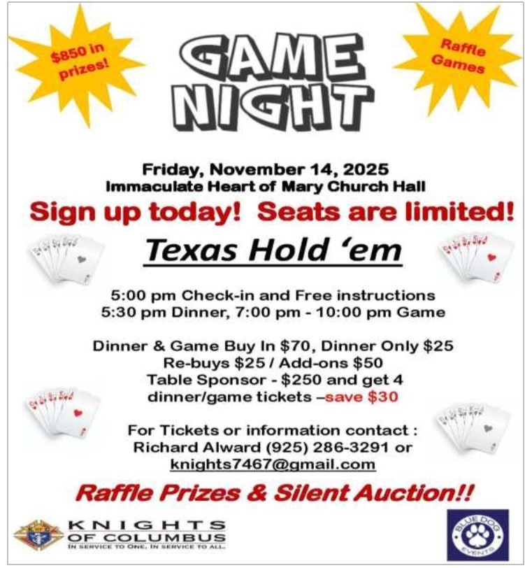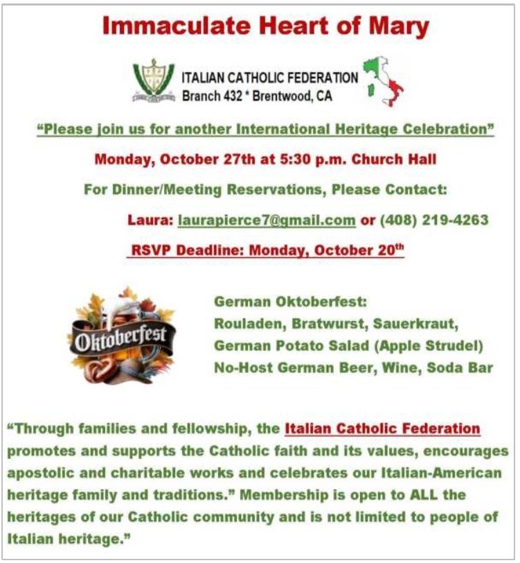 DESAYUNO DE PANQUECASVengán a visitar con sus amigos parroquianos y darles la bienvenida a los nuevos parroquianos al desayuno de pancakes el primer Domingo de cada mes. Horario del desayuno es de 8:15am a 12:00pmIHM Crafters Holiday BoutiqueFriday, Oct. 24th: 2pm-6pmSaturday, Oct. 25th: 10am-6:30pmSunday Oct. 26th: 8am-2pm Start Your Holiday Shopping!Homemade craft items, baked goods and plants.Raffle tickets on sale weekends before and during Boutique.Fil-Am Ministry celebrates San Pedro Calungsod FeastThe Fil-Am ministry will be celebrating the feast of their second Filipino Saint "San Pedro Calungsod" (patron saint of the youth and voyagers) on October 26, 2025 at the 12:30 PM Mass with a small reception to follow at the hall after Mass. All parishioners are cordially invited to participate. A 9-day novena will be held from Oct 17 to 25 at 6:30 PM. For more info: Contact Beni Oliquino at 925-322-2758 or email: ihmbeni24@gmail.com.Women’s Faith Sharing & Bible StudyNew study: Foundations of FaithA Journey Through the Catechism of the Catholic Church will help you understand the teachings and how they fit into your life. Through this program, the teachings of the Church will come into focus through an amazing series of videos shot in more than 40 locations around the world. Series contain 20 sessions. We will cover session 1-10 from September 11 to November 13, 2025. Session 11-20 will finish starting January 2026. Dates to be determined. Workbook is $40. and is optional. Helpful but not necessary to attend. Workbook is available through Ascencionpress.com. If you should have any questions please contact Ethel Reber at: (925) 759-0430.IHM Children's Choir / Coro de Niños de IHMCome and register for the IHM Children's Choir this seasonIn EnglishRehearsals: Wednesday 5:00pm-6:00pmwith Mr. Jerome Cuencobegins September 2025For more information on the English Children's Choir, please contact Jerome Cuenco: jcuenco@ihmbrentwood.com, or (925) 634-4154 x112 +++Ven y registrarse para el Coro de Niños de IHM esta temporadaEn espanolEnsayos: viernes 4:00pm-5:10pmcon Hna. Guadalupe Grande, MSScomienza el septiembre de 2025Para más información sobre el Coro de Niños en espanol, por favor contacte a la Hna. Guadalupe Grande: grande815@msn.com, o (925) 513-8154Altar Server Invitation–No Experience NecessaryThe Spanish and English Altar Server Ministries are accepting new applicants. To be eligible, your family must be registered in the parish, you must have made First Communion, and have a willingness to serve our Lord at the altar. If you are interested, please contact Tim Guernsey at tguernsey@sbcglobal.net, or call 925-457-4519Please park correctly / Por favor, estacione correctamenteThank you for not parking in red zones. However, we would appreciate if you could be sure to park straight in the parking stalls. We have noticed several open parking spaces because cars are parked at an angle or over the lines. If everyone would be better at parking straight there would be more available parking spaces. Again thank you for your cooperation.Gracias por no estacionar en las zonas rojas. Sin embargo, le agradeceríamos que se asegure de estacionar derecho en los puestos de estacionamiento. Hemos notado varios espacios de estacionamiento vacios porque los autos están mal estacionados, en angulo o sobre la linea blanca. Si todos pudieran estacionar derechos habrian mas puestos libres para estacionar. De nuevo gracias por su cooperacion.Catechesis CornerThe Catechesis Corner is a monthly newsletter which highlights aspects of the faith. You can find the latest edition of the Catechesis Corner in the vestibule. You can also sign up to receive it once monthly via Flocknote. Go to Flocknote and join the IHM Catechesis Corner group or send your request to Deanna at d.betschart24@outlook.com.El Catechesis Corner es un boletín mensual que destaca aspectos de la fe. En el vestíbulo se encuentra la última edición del Catechesis Corner. También pueden registrarse para recibirlo una vez al mes a través de Flocknote. Vaya a Flocknote y únase al grupo de IHM Catechesis Corner o envíe su solicitud a Deanna al d.betschart24@outlook.com.Youth CornerS.A.L.T. LeadershipApplications for S.A.L.T. teens (Students and Adults Leading Together) are now open. This team of teens help with various events throughout the year, like leading small groups, assisting at Mass in different capacities, retreat leaders, EDGE program and other awesome events. Please email Julie (ihmyouthbrentwood@ gmail.com) to get an application. A great way to get involved, meet more people, celebrate your faith while having fun.SAINT(s) - Real Life Role Models:Lets hear it for a few of God's amazing Holy heroes: St. Maria Goretti (Patroness of Youth and Young Women) , St. Benedict (Patron of Students), St. Kateri( Covert to the faith at age 19) and St. Ann and St. Joachim (Grandparents to Jesus). Check out these amazing role models. Some are young - some are older. As you check into their stories you may a find a new heavenly friend to accompany you on your journey. One website to look up Saints is atholiconline.org/saints/Youth Ministry Invites You!!We welcome all teens grades 6-12 to join our Edge Middle School Ministry, Tuesdays 4:15-5:15pm, or our High School Youth Ministry program, Thursdays 6:30-8pm. Enrollment is taken year around for these groups! We participate in Bible studies, faith talks, prayer experiences, games, retreats, snacks and social events. Please email Julie Figueroa at ihmyouthbrentwood@gmail.com for more information. All are welcome!