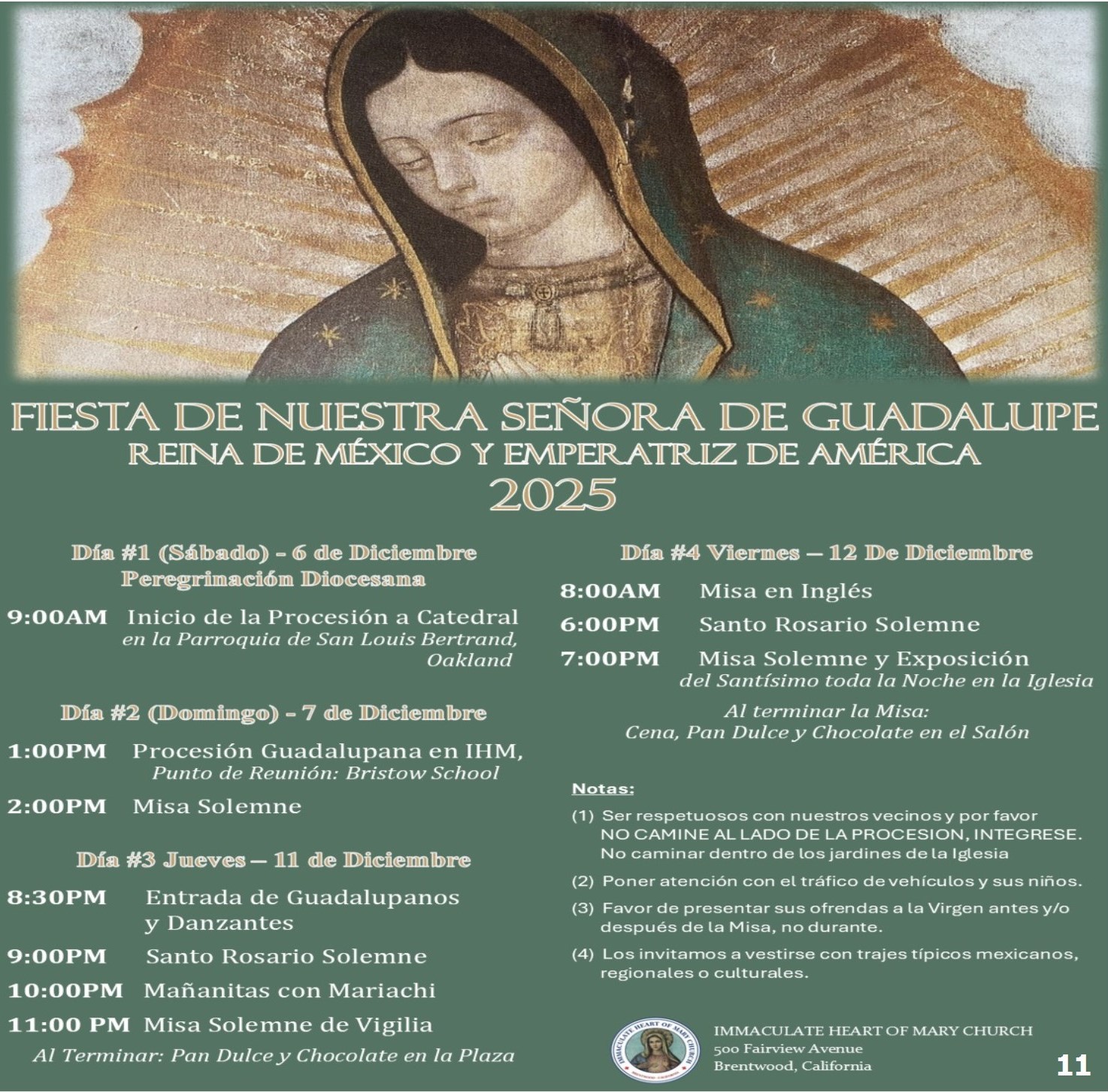 DESAYUNO DE PANQUECASVengán a visitar con sus amigos parroquianos y darles la bienvenida a los nuevos parroquianos al desayuno de pancakes el primer Domingo de cada mes. El póximo domingo el desayuno será patrocinado por el Ministerio de la Legion of Mary/Eng. Horario del desayuno es de 8:15am a 12:00pmDeanery 10 AdventConfession ScheduleThe Good Shepherd: 12/10/25 @ 7 pmImmaculate Heart of Mary: 12/16/25 @ 7 pmSt. Peter Martyr: 12/17/25 @ 7 pmSt. Anthony: 12/18/25 @ 7 pmMost Holy Rosary: 12/19/25 @ 7 pmLiturgical Ministers NeededWe need to replenish our Mass ministers for 5:00 PM Saturday, 7:30, 9:00 and 12:30 Sunday. We need all liturgical Ministers for each mass (Greeters, Ushers, Lectors and Eucharistic Ministers). If you are interested in checking on any of these ministries, please come by the sign-up table out on the plaza on Nov 22 and 23 after each mass. You can sign up at that time or call or come by the office to put your name on a list as a prospect. We will have a training session on January 15, 2026 at 7:00 PM for each ministry with some scripture-based training and breakout minister training to follow. February Ministry assignments will be the first assigned roll. This training may be important to those serving in the ministry as well. Everyone is welcome. Any questions can be directed to Dcn John at the e-mail address or phone in your bulletin.An evening of Prayer and Song with a renowned Catholic singer songwriter All are welcome to join us for an evening of Prayer and Song with renowned Catholic singer songwriter, Jesse Manibusan. Wednesday, December 10 from 7-8pm in the Church. We hope to see you there! For more information please email Julie Figueroa at: jfigueroa@ihmbrentwood.com +++Todos son bienvenidos a unirse a nosotros en una velada de oración y canto con el renombrado cantautor católico Jesse Manibusan. El miércoles 10 de diciembre de 19:00 a 20:00 en la Iglesia. ¡Esperamos verte allí! Para más información, por favor escriba a Julie Figueroa a: jfigueroa@ihmbrentwood.comFORMEDHave you tried FORMED streaming service yet? Think: Netflix for Catholics!Formed online video service includes studies, movies, lectures and amazing Saint stories in both English and Spanish. There is also a children’s section with streaming options for young children to view and learn about the faith. This family friendly streaming service is free for our IHM family as we have paid for a streaming license for our families to use and enjoy this resource. Please use the code below, create a free account and there will be no cost.Formed.org (Code #CM7TEZ)Altar Server Invitation–No Experience NecessaryThe Spanish and English Altar Server Ministries are accepting new applicants. To be eligible, your family must be registered in the parish, you must have made First Communion, and have a willingness to serve our Lord at the altar. If you are interested, please contact Tim Guernsey at tguernsey@sbcglobal.net, or call 925-457-4519Please park correctly / Por favor, estacione correctamenteThank you for not parking in red zones. However, we would appreciate if you could be sure to park straight in the parking stalls. We have noticed several open parking spaces because cars are parked at an angle or over the lines. If everyone would be better at parking straight there would be more available parking spaces. Again thank you for your cooperation.Gracias por no estacionar en las zonas rojas. Sin embargo, le agradeceríamos que se asegure de estacionar derecho en los puestos de estacionamiento. Hemos notado varios espacios de estacionamiento vacios porque los autos están mal estacionados, en angulo o sobre la linea blanca. Si todos pudieran estacionar derechos habrian mas puestos libres para estacionar. De nuevo gracias por su cooperacion.Catechesis CornerThe Catechesis Corner is a monthly newsletter which highlights aspects of the faith. You can find the latest edition of the Catechesis Corner in the vestibule. You can also sign up to receive it once monthly via Flocknote. Go to Flocknote and join the IHM Catechesis Corner group or send your request to Deanna at d.betschart24@outlook.com.El Catechesis Corner es un boletín mensual que destaca aspectos de la fe. En el vestíbulo se encuentra la última edición del Catechesis Corner. También pueden registrarse para recibirlo una vez al mes a través de Flocknote. Vaya a Flocknote y únase al grupo de IHM Catechesis Corner o envíe su solicitud a Deanna al d.betschart24@outlook.com.Youth CornerS.A.L.T. LeadershipApplications for S.A.L.T. teens (Students and Adults Leading Together) are now open. This team of teens help with various events throughout the year, like leading small groups, assisting at Mass in different capacities, retreat leaders, EDGE program and other awesome events. Please email Julie (ihmyouthbrentwood@ gmail.com) to get an application. A great way to get involved, meet more people, celebrate your faith while having fun.SAINT(s) - Real Life Role Models:Lets hear it for a few of God's amazing Holy heroes: St. Maria Goretti (Patroness of Youth and Young Women) , St. Benedict (Patron of Students), St. Kateri( Covert to the faith at age 19) and St. Ann and St. Joachim (Grandparents to Jesus). Check out these amazing role models. Some are young - some are older. As you check into their stories you may a find a new heavenly friend to accompany you on your journey. One website to look up Saints is atholiconline.org/saints/Youth Ministry Invites You!!We welcome all teens grades 6-12 to join our Edge Middle School Ministry, Tuesdays 4:15-5:15pm, or our High School Youth Ministry program, Thursdays 6:30-8pm. Enrollment is taken year around for these groups! We participate in Bible studies, faith talks, prayer experiences, games, retreats, snacks and social events. Please email Julie Figueroa at ihmyouthbrentwood@gmail.com for more information. All are welcome!