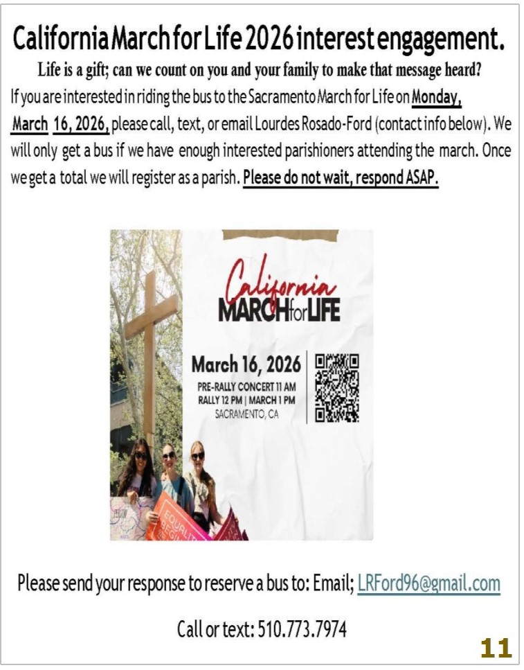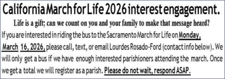 Are you interested in deepening your understanding of, and engagement in the Mass and drawing closer to Jesus? Come join us for a scripture study to delve into the coming weekly readings. Group meets weekly on Fridays at 3:30pm in the Library.Está Ud interesado en profundizar su comprensión, y compromiso en la Misa y acercarse más a Jesús? Venga y unase a nuestro grupo para un estudio de las escrituras para las próximas semanas. El grupo se reúne los lunes as las 7:00pm en el salón A.English: D. Allan Steinhardt, cell 925-200-0115Spanish: Sister Januaria Beleño, januariab@gmail.comAds for the bulletin:/Avisos para el boletín:Ads for the bulletin: We are requesting if you are a business owner or know a business owner to consider placing an ad in our bulletin. It is the ads that allow us to have a bulletin weekly with no cost to us. For Ads call: 1-800-950-9952 LPI or email 4lpi.com.Thank you!!Avisos para el boletín: Estamos solicitando que si usted es dueño de un negocio o conoce a un dueño de un negocio, considere poner un anuncio en nuestro boletín. Son los anuncios los que nos permiten tener un boletín semanal sin costo alguno para nosotros. Por favor llame para colocar el anuncio al 1-800-950-9952 LPI o correo electronico 4lpi.com. Gracias!!